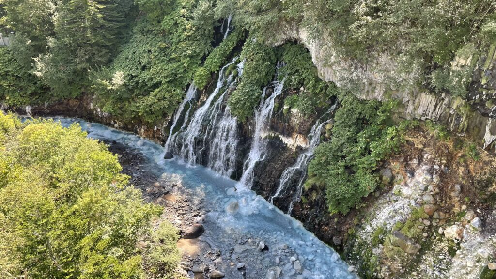 滝の下を流れる美瑛川上流は「青い池」と同じ現象で青色になっています。青い色と白い滝のコントラストがいいですね。所要時間は15分あればいいでしょう。