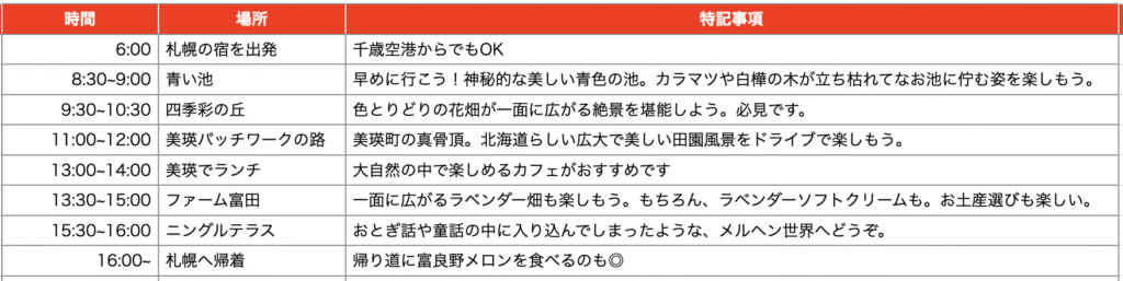 日帰りではなくとも、1泊2日(たとえば夕方に新千歳空港に到着し、夜に富良野に移動)の場合でも、このモデルコースは参考になるかなと思います。